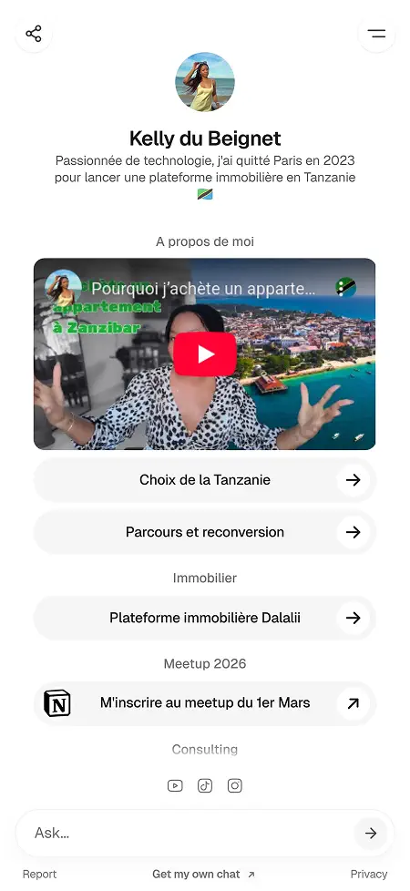 Share one link. They land on your page, discover your world, your offers, your story, and get every question answered in their language, 24/7.